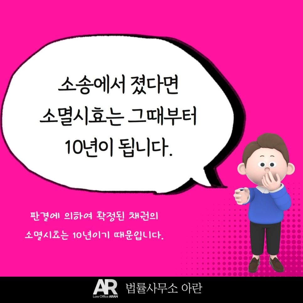 채권자가 채무자에게 소송을 제기하여 승소한 적이 있다면, 이제 소멸시효는 10년으로 바뀝니다. 확정된 판결에 따른 채권의 소멸시효는 10년이라고 법으로 정해져 있기 때문입니다.