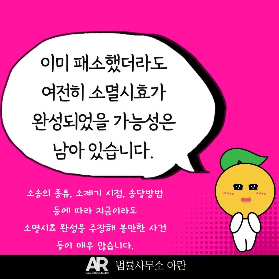 따라서 아무리 수십년 전에 빌린 돈이라고 하더라도 채권자가 그 사이에 채무자를 상대로 소송을 한 적이 있었다면, 소멸시효가 남아 있을 가능성이 매우 큽니다.
