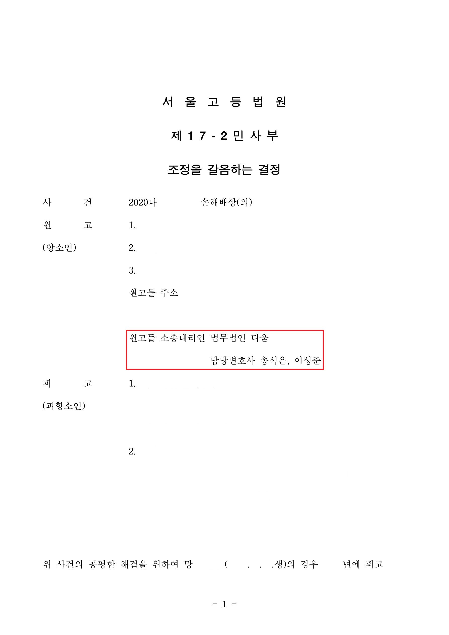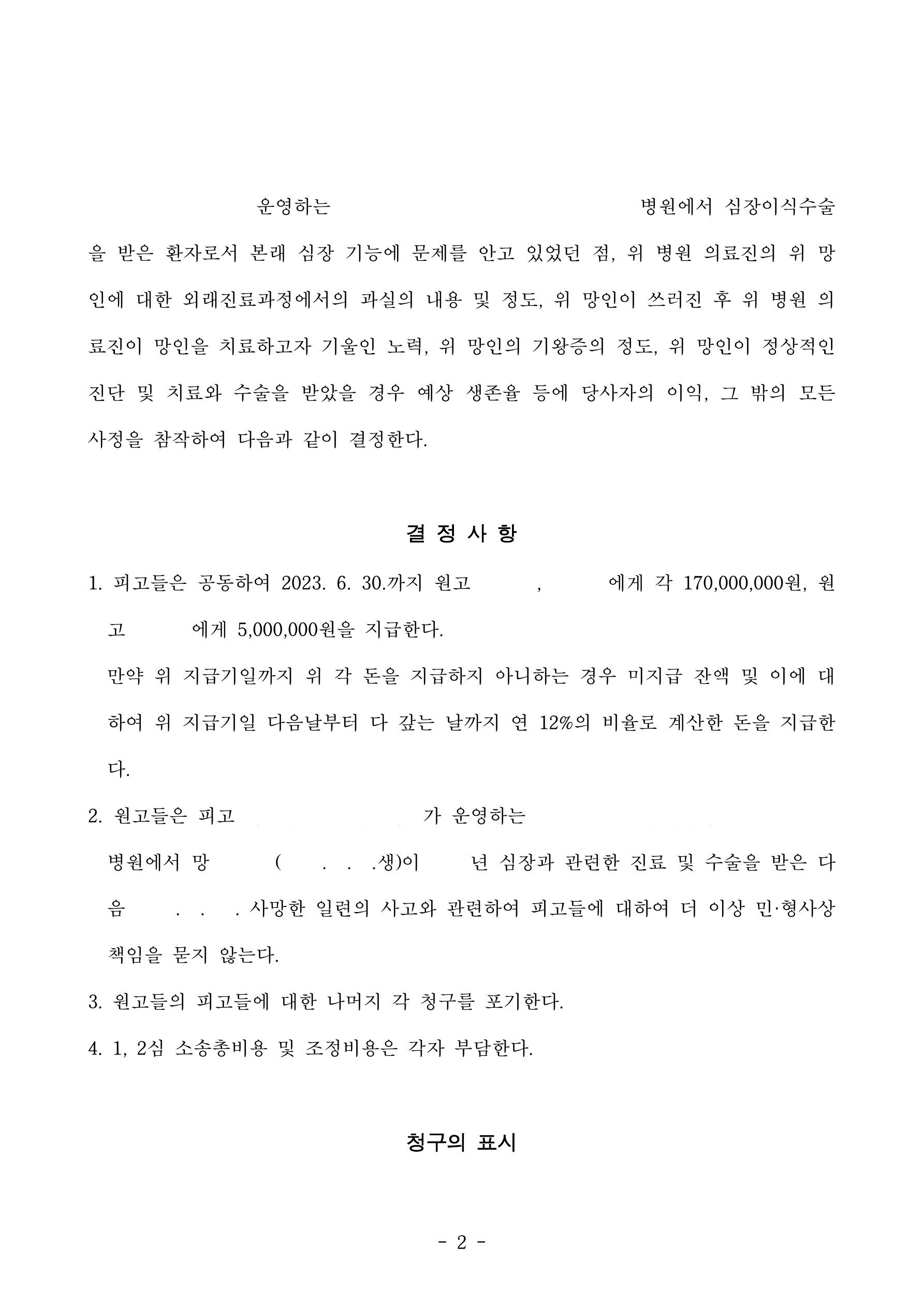 법원은 위와 같은 주장 내용 및 입증자료를 검토한 후 '병원측이 환자측에 총 3억 4,500만 원을 지급하라'는 내용의 조정결정을 내렸고, 법원의 조정결정에 대하여 환자측과 병원측 모두 이의하지 않고 수용하기로 하여 결국 본 의료사고 사건은 조정결정 내용대로 확정되었습니다.