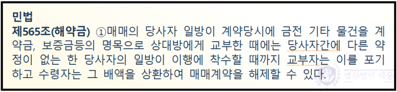 보통 아파트 같은 부동산 매매계약을 체결하면 -전세 계약도 마찬가지고요- 계약금을 지급하고 중도금이나 잔금을 지급할 때까지는 어느 정도 기간이 있죠. 근데 그 사이에 시세가 뚝뚝 떨어져서 계약금을 포기하고라도 계약을 해제하고 싶은 경우가 있을 수 있습니다. 물론 집값이 오르는 경우에는 반대로 집주인이 계약을 해제하고 싶을 수도 있고요.