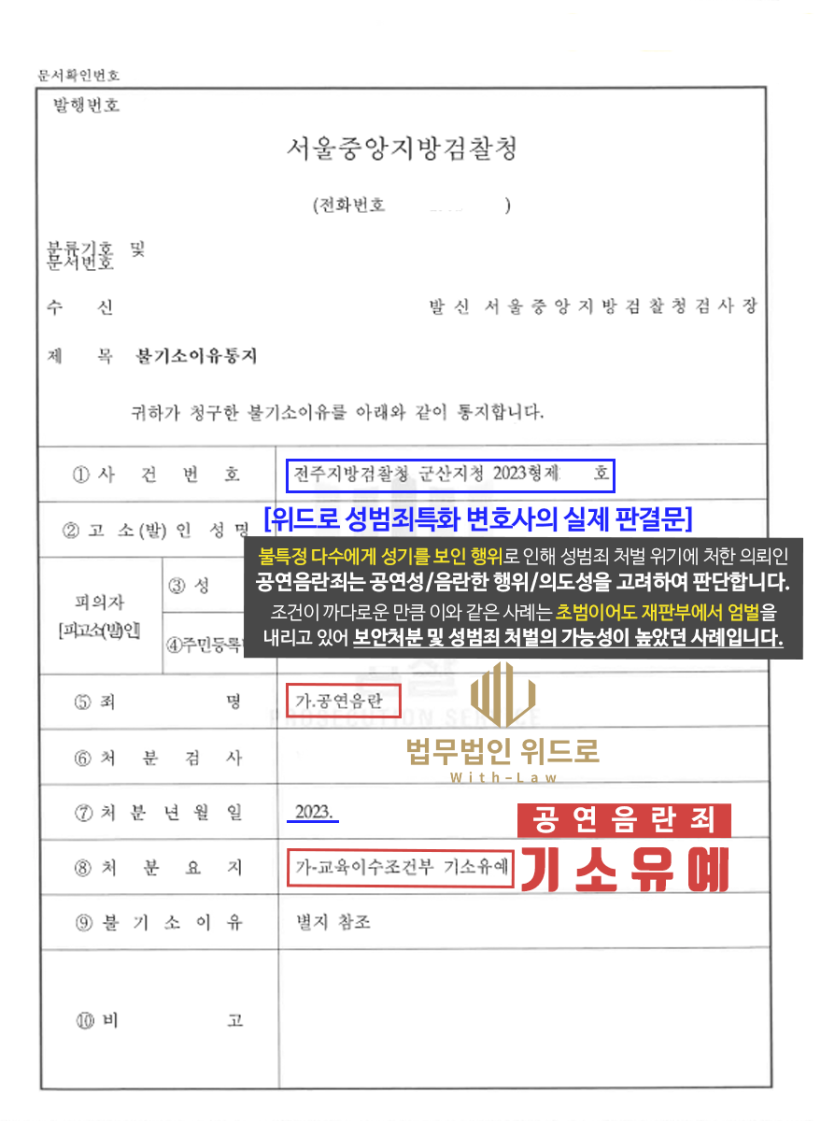 ▶ 위드로 성범죄 전문변호사가 경찰조사 동행부터 검찰단계에서 자세한 변호인의견서 제출 등을 철저하게 조력하여, 수사단계에서 기소유예 처분으로 종결.