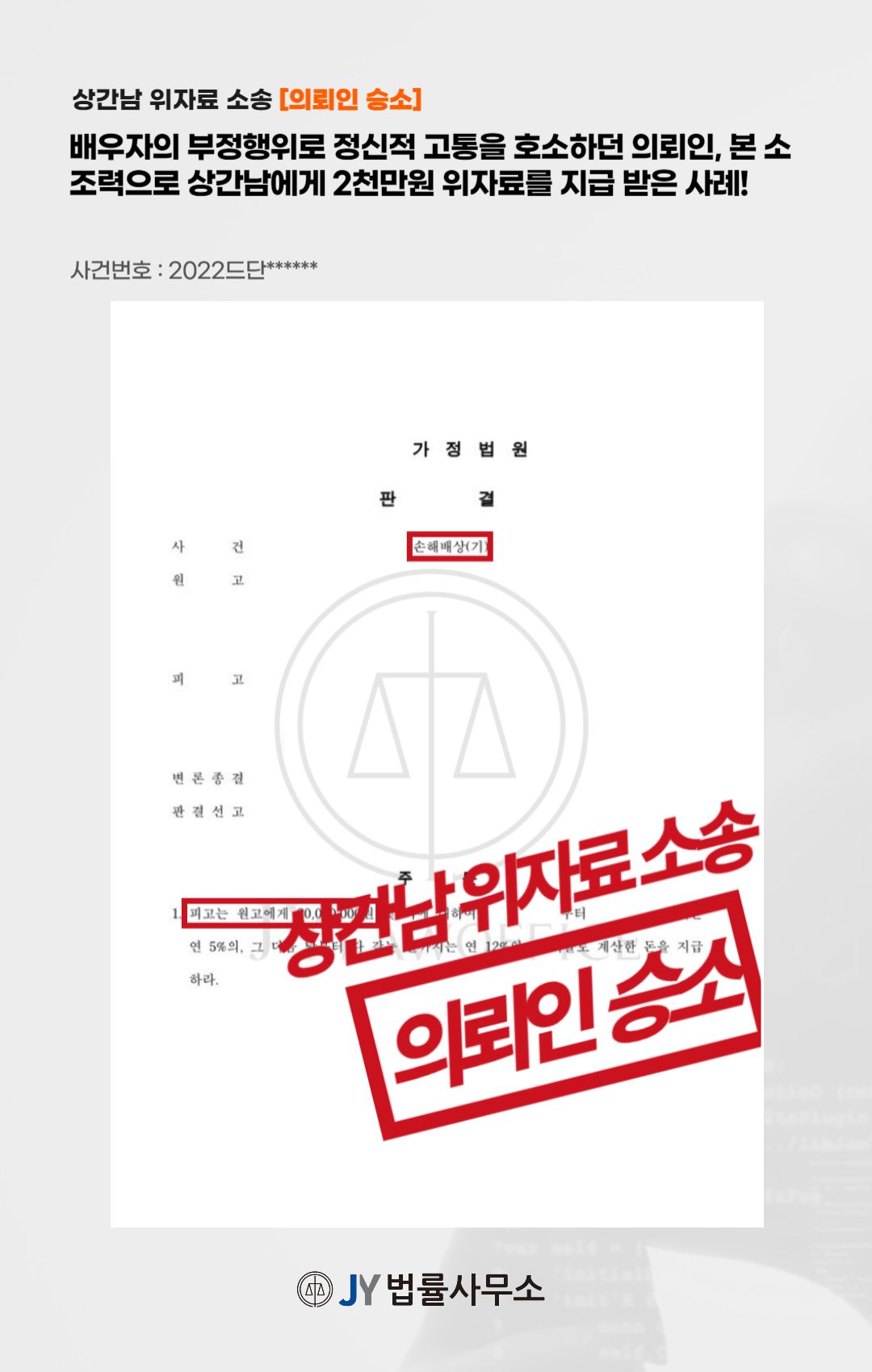 본 사건의 의뢰인은 법률상 배우자가 부정행위를 한 사실을 확인하고 부정행위를 저지른 피고를 상대로 손해배상을 청구하기 위해 본 JY법률사무소를 찾아주셨습니다.