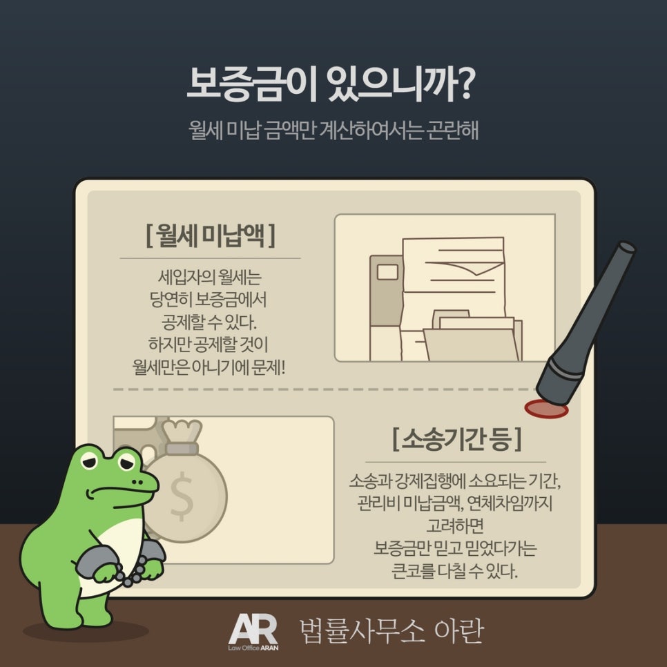 여기까지 생각하면 단순히 월세 미납금액만 계산하여 '보증금에서 공제하면 되겠지'라고 생각했다가는 크게 손해를 입을 수 있습니다.