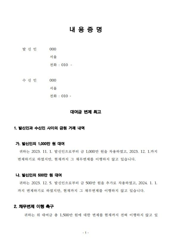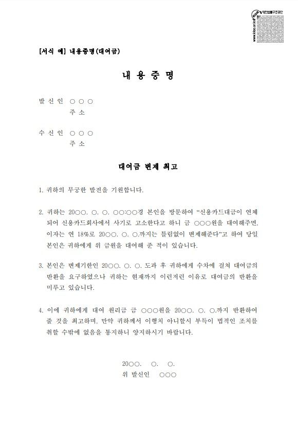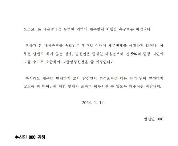 [대여금 내용증명 서식]