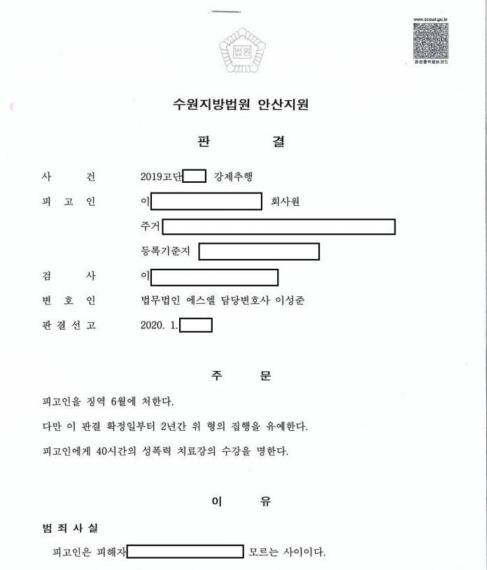 의뢰인께서 술에 취한 나머지 피해여성을 끌어안고 골목길로 데려가 가슴 등의 부위를 강제추행하였습니다. 골목길로 데리고간 행위가 자칫하면 강간미수로 미칠수 있었기때문에 수사초기부터 저희는 혐의사실이 확대되는 것을 방지하는 것에 초점을 맞추었고 다행히 강제추행으로만 기소될 수 있었습니다. 저희 법무법인 에스엘은 양형참작사유를 최대한 읍소하여 피고인의 집행유예 판결을 이끌어 내었습니다.