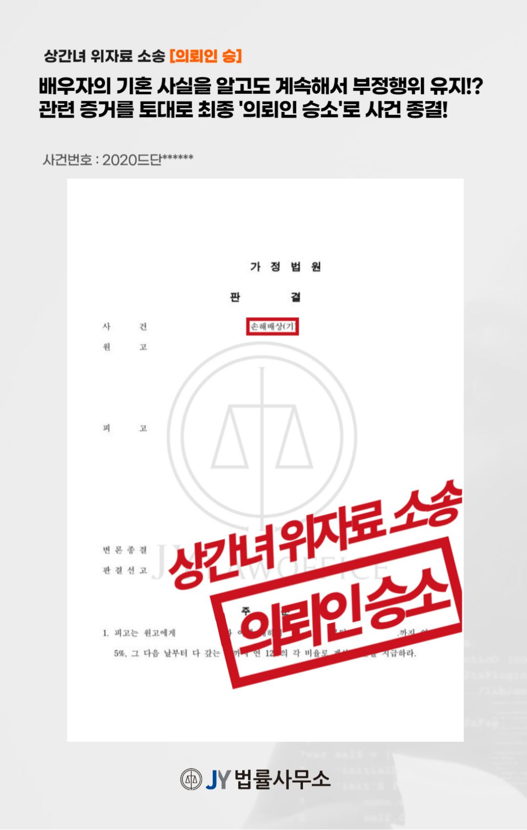 본 사건의 피고는 의뢰인의 배우자가 기혼인 사실을 알고 있음에도 지속해서 의뢰인의 배우자와 부정행위를 이어왔습니다. 이에 의뢰인은 정신적 피해를 호소하며 피고를 대상으로 손해배상을 청구하기 위해 JY법률사무소를 찾아와 주셨습니다.