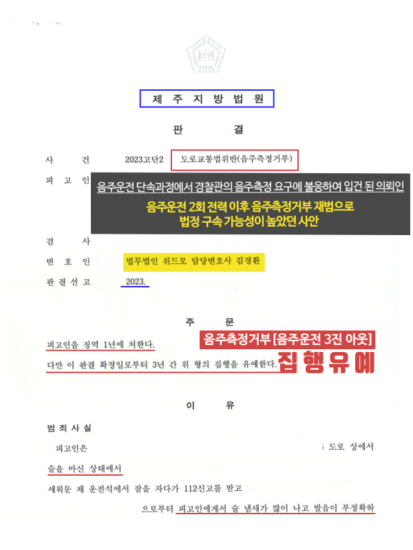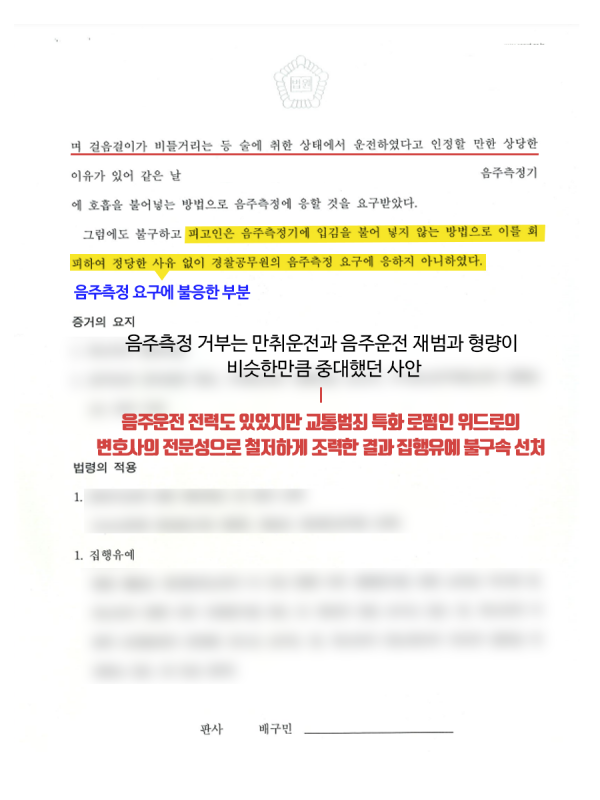 * 음주측정거부죄는 만취운전 및 상습 음주운전자와 처벌 수위가 비슷할 정도로 매우 엄중한 사안이니, 해당 사건에 연루가 된 운전자라면 위 사례를 참고하셔서 사건초기부터 위드로 조력을 받으시길 바랍니다.