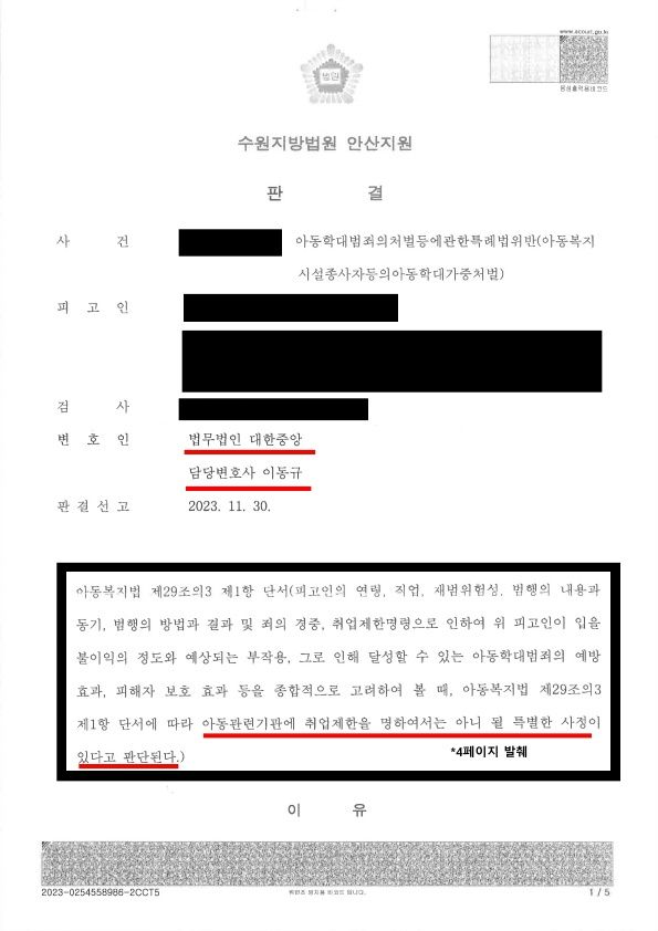 아동학대 사건에 경험이 많은 이동규 변호사는 A씨가 유형력을 행사하였지만 피해자가 느낀 체벌의 강도와 두려움을 고려할 때 신체적 학대에 이르지 않는다는 점을 주장하였고, 아동학대 양형기준에서 유리하게 참작될 수 있는 사유를 충분히 제시하는 방향으로 사건을 진행했습니다. 그리고 "취업제한을 명하여서는 아니 될 특별한 사정"을 입증하였습니다.