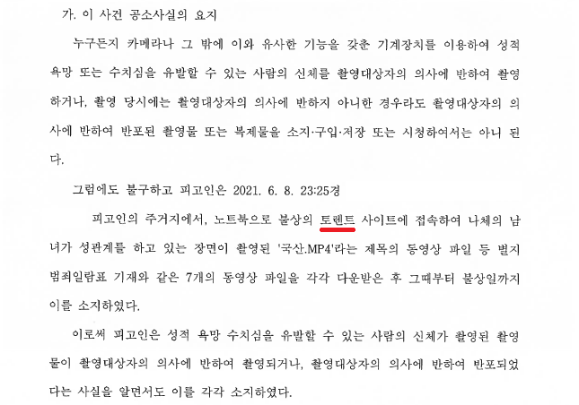 A씨는 2021. 6. 8. 23:25경 토렌트로 '얼굴유출 고화질작' 불법촬영물 시드파일을 다운로드받아 소지한 혐의로 재판을 받았습니다.