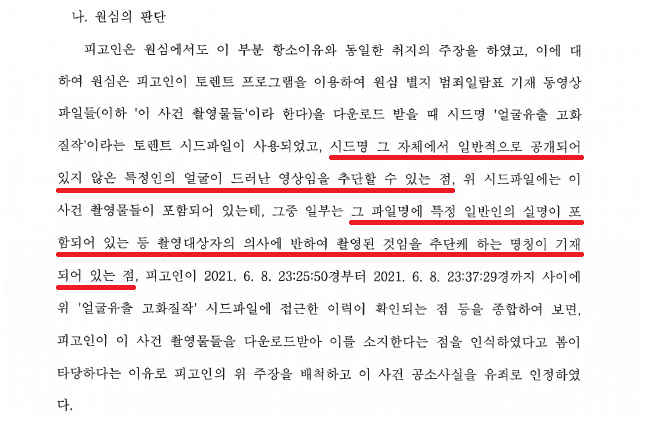 그러나 1심은 ① 시드명 그 자체에서 일반적으로 공개되어 있지 않은 특정인의 얼굴이 드러난 영상임을 추단할 수 있는 점, ② 파일명에 특정 일반인의 실명이 포함되어 있는 등 촬영대상자의 의사에 반하여 촬영된 것임을 추단케 하는 명칭이 기재되어 있는 점 등을 이유로 A씨의 주장을 배척하고 유죄로 인정하였습니다.