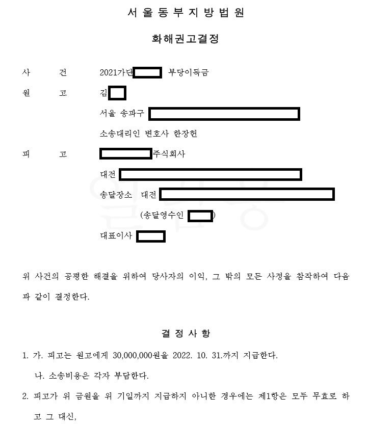 재판부에서 제안한 화해권고에 동의한 사건입니다.