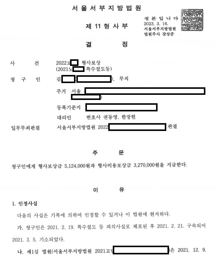 이에 피고인은 이에 관한 형사보상청구를 진행하게 되었습니다.