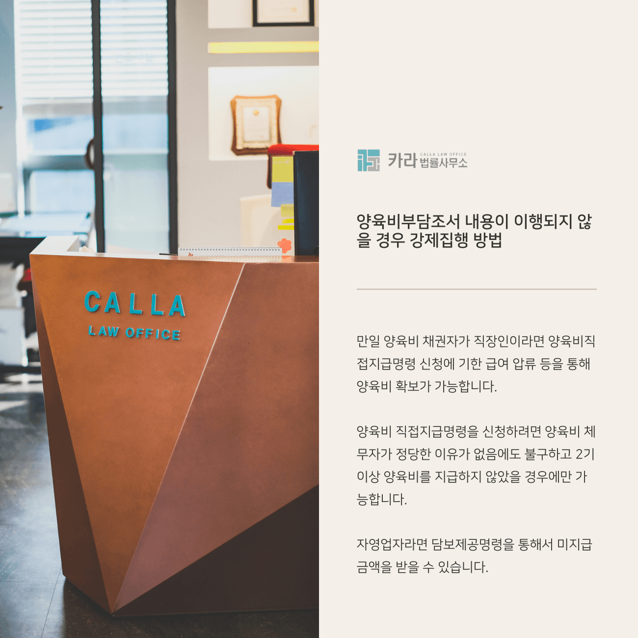 이번 시간에는 협의이혼에 의한 양육비 합의가 이행되지 않는 경우 법적으로 이를 강제할 수 있는 수단에 대해 알아보도록 하겠습니다.