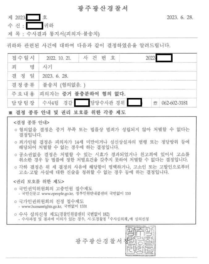 경찰 단계 불송치(무혐의) 받은 사안을 소개해 드리겠습니다.