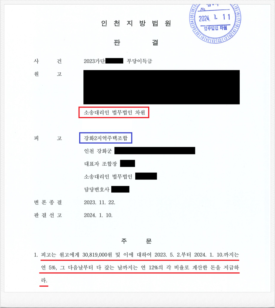 그러나, 가입 후 강화2지역주택조합 측이 진행하는 사업이 계획대로 진행되지 않았고, 이에 의뢰인은 정식 민사소송을 통하여 조합과 체결한 계약을 취소한 후 기 납입한 금원의 반환을 원하셨습니다.