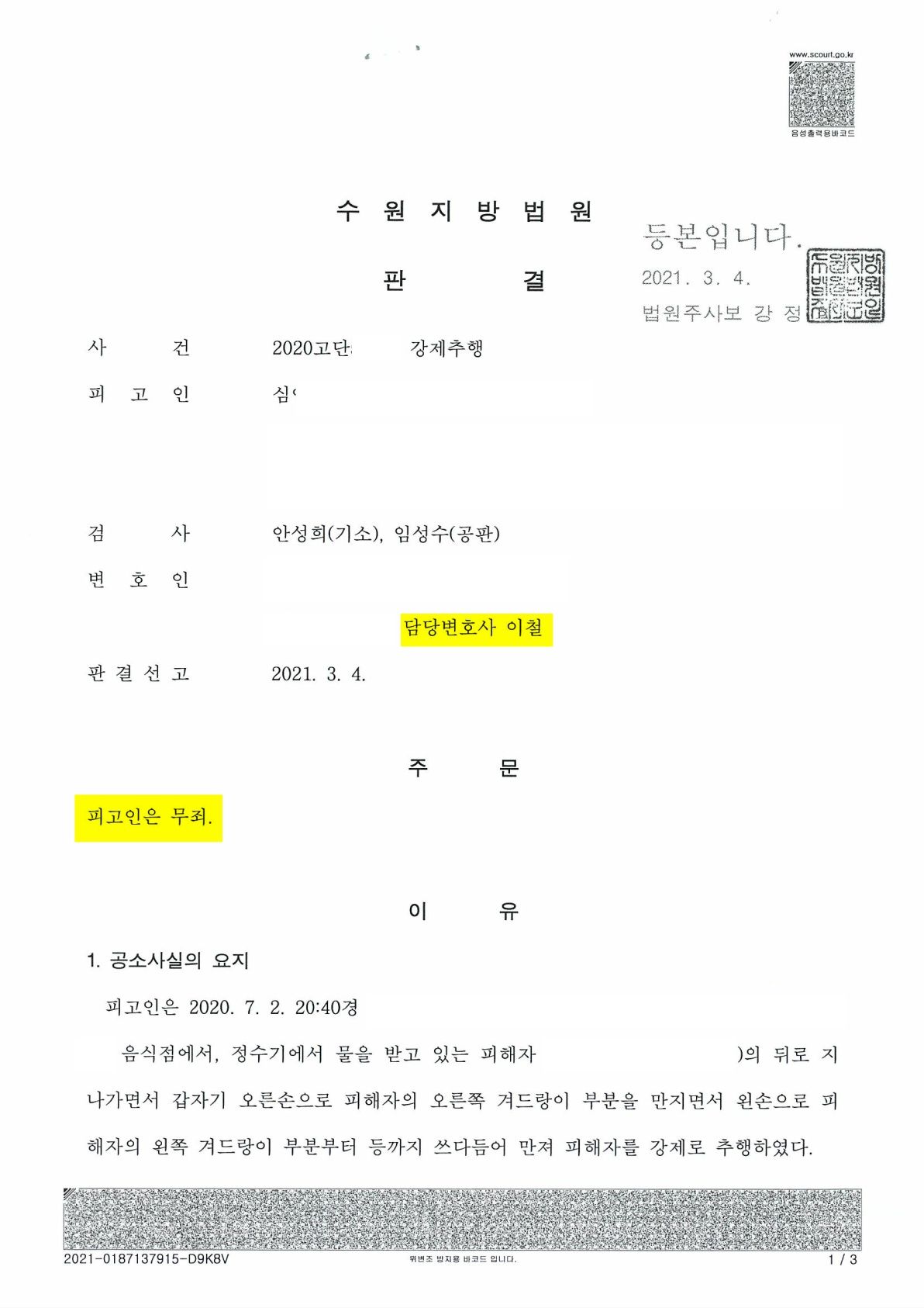 결국 담당 재판부는 범죄의 증명이 없는 경우에 해당한다고 보아, 무죄 판결을 선고하였습니다.