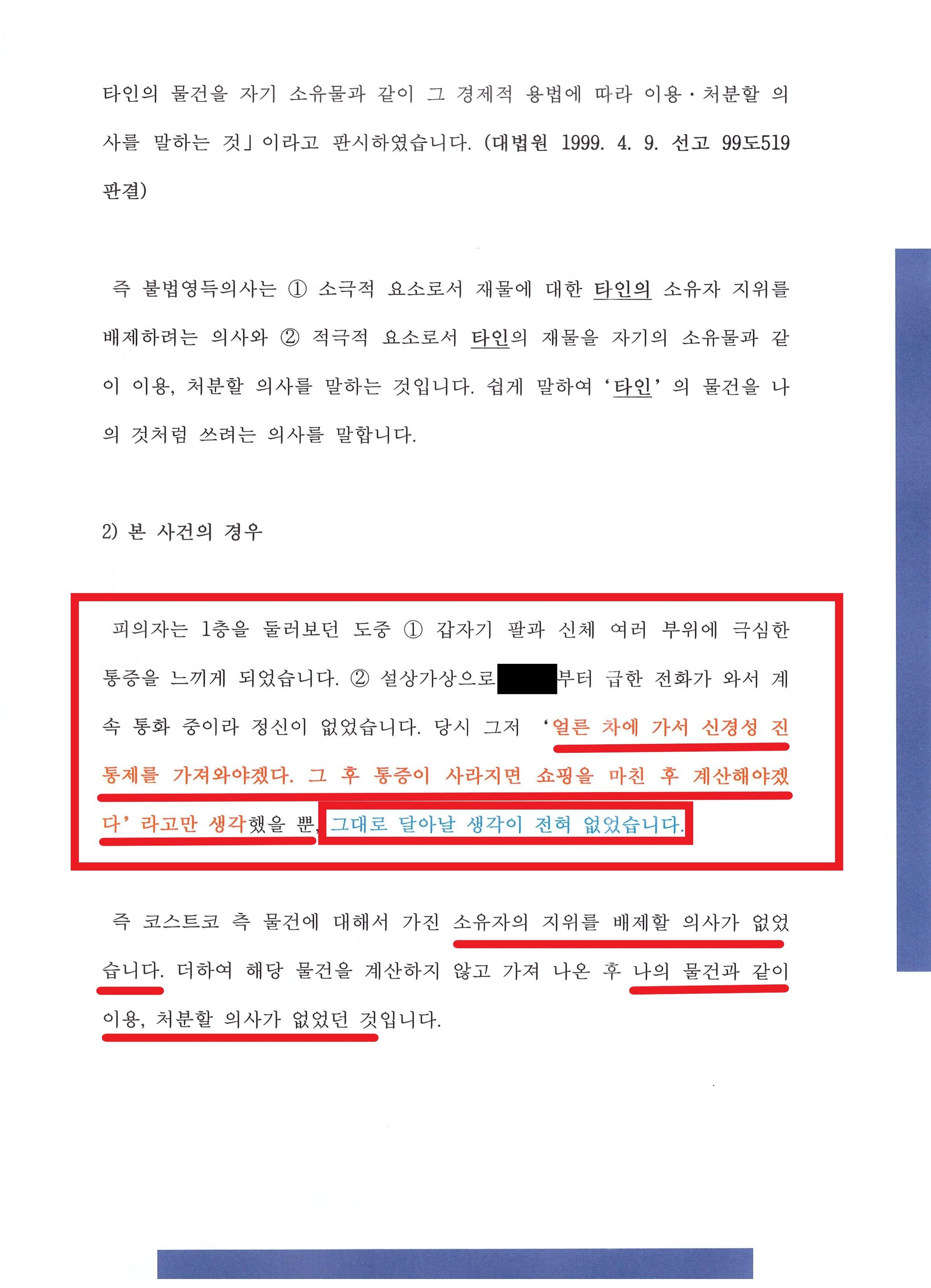 - 즉 물건을 계산하지 않고 가져 나온 후 나의 물건과 같이 이용, 처분할 의사가 없었음