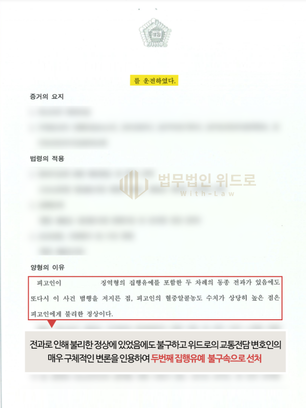 동종범죄로 여러번 처벌받았던 점, 그 중 음주운전으로 집행유예를 선고받았던 점에서 실형 법정구속 될 확률이 매우 컸지만, 재판부는 위드로 담당 변호사의 변론을 참작하여 마지막 선처라며 두번째 집행유예(음주운전) 불구속 판결을 하였습니다.