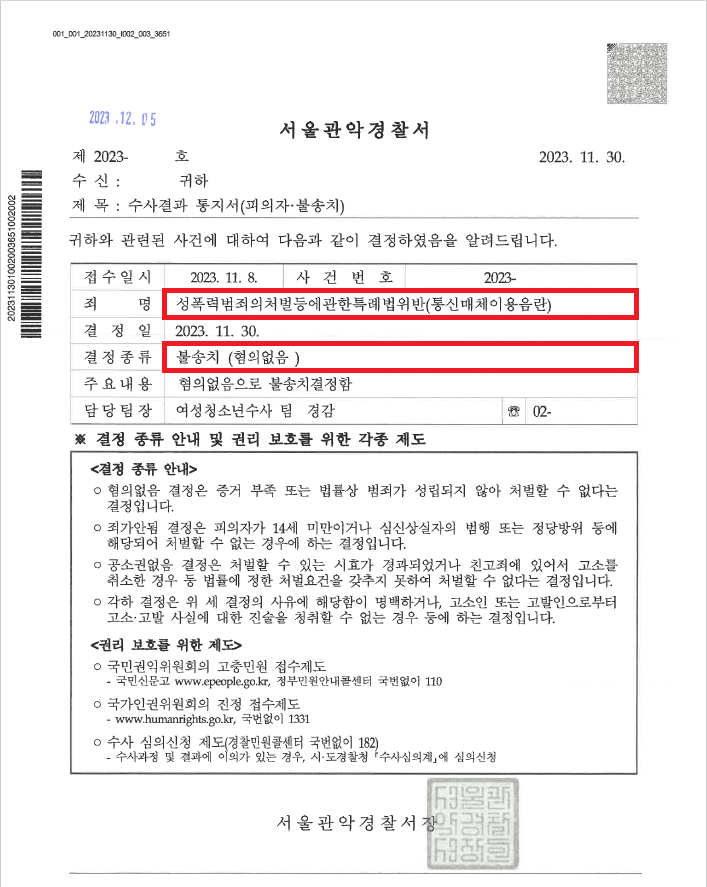 이러한 저의 조력을 바탕으로 A씨는 '불송치(혐의없음)' 결정을 받음으로써 섣불리 대응하였다면 얼마든지 될 수 있었던 성범죄자가 될 위기에서 벗어날 수 있었습니다.