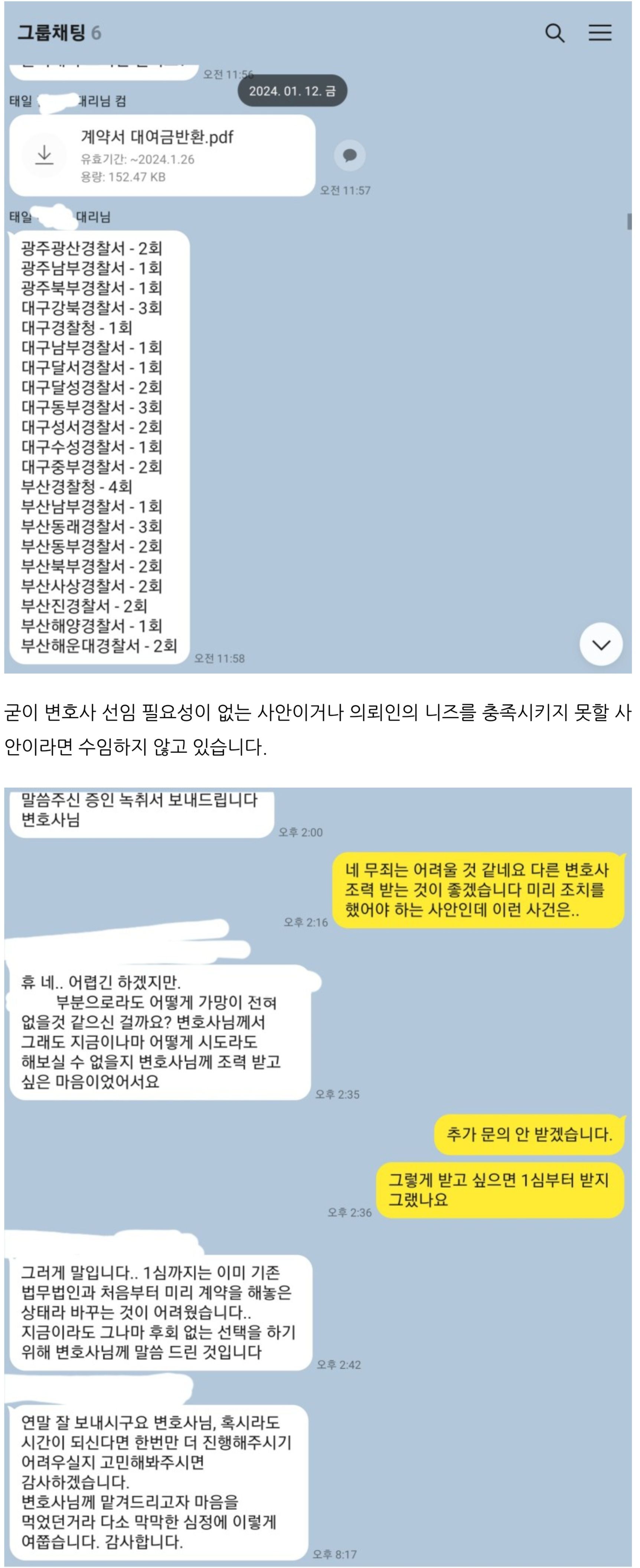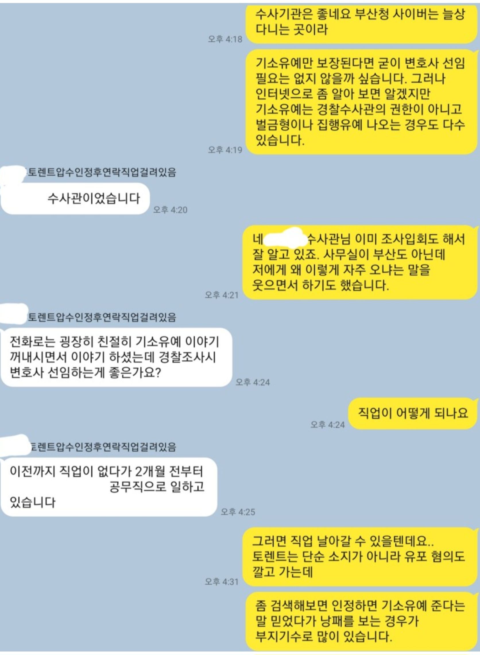 작년 11월초 부산경찰청으로부터 압수수색을 당하여 데스크탑까지 압수당한 이후 연락이 왔습니다. 오랜기간 백수생활을 하다가 일을 시작한지 얼마되지 않았기 때문에 금전적인 문제인지 직업이 걸려 있음에도 변호사를 선임할지 많은 고민이 있는 것 같았습니다.