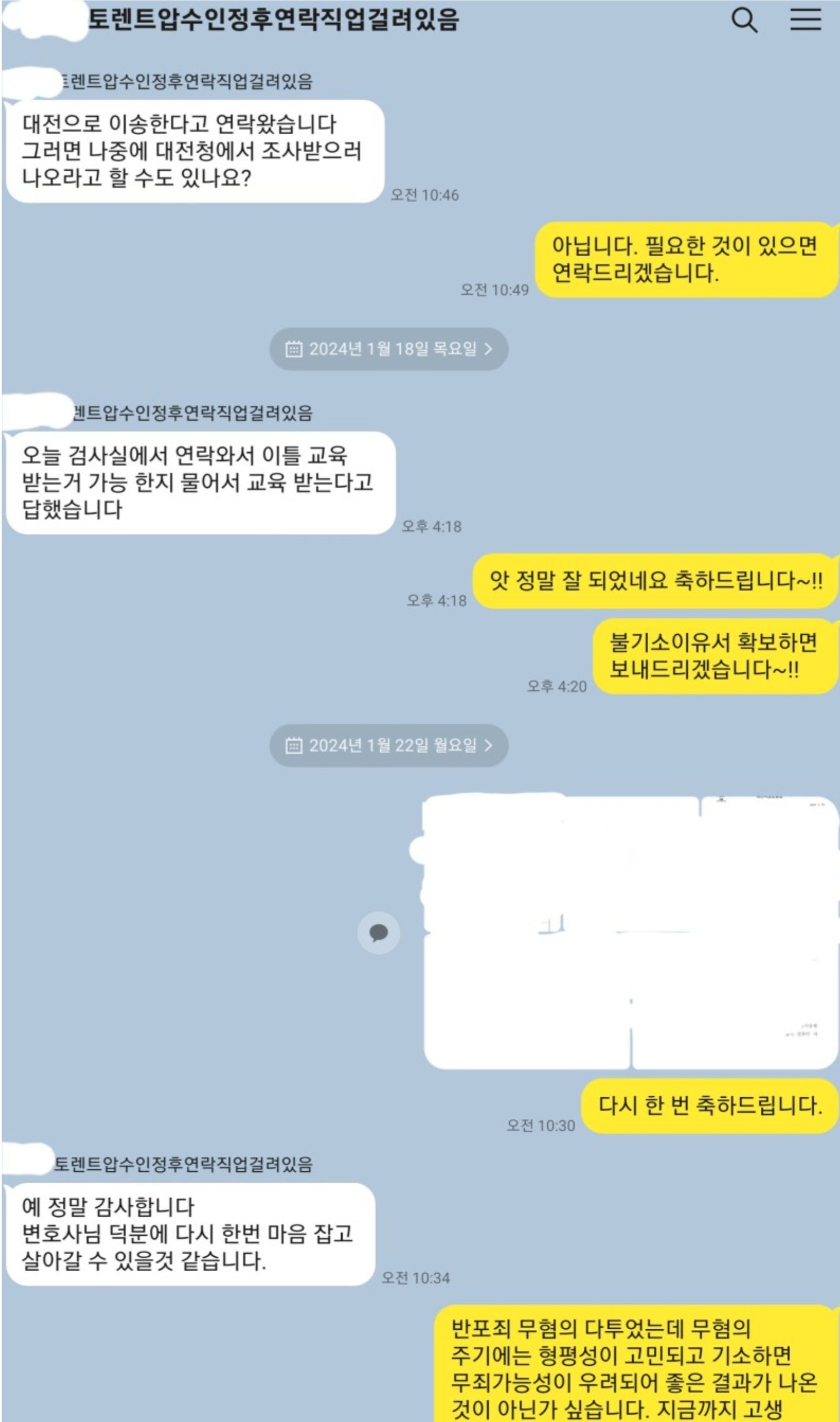 연말을 넘기고 대전지검으로 사건이 이송되기까지 한 이후에 기소유예라는 기쁜 소식을 받을 수 있었습니다. 오늘 오후에도 경기남부경찰청 토렌트 사건으로 조사입회를 가는데 경기남부경찰청 토렌트 사건들도 마찬가지로 기소유예가 잘 나오지 않는 점을 저는 잘 알고 있습니다.