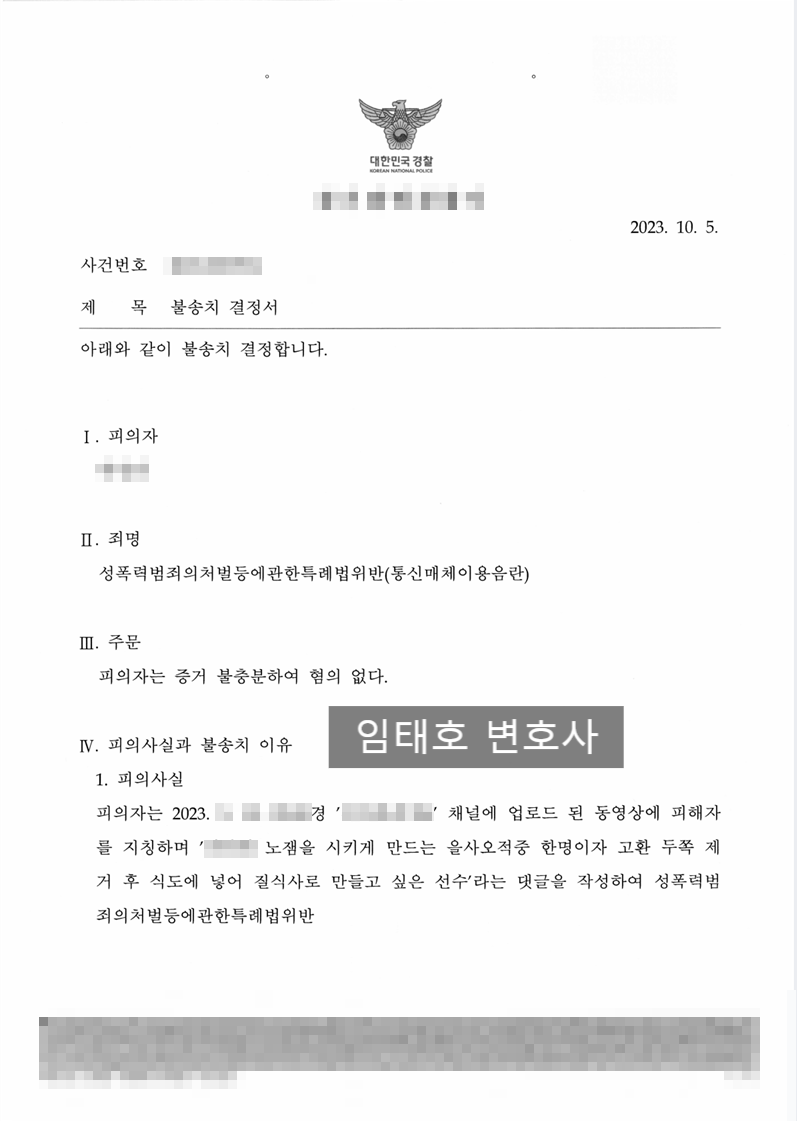 확인해 보면 이 사건 피의자와 피해자는 일면식이 전혀 없고 유튜브 영상 댓글을 작성된 점은 인정된다는 것으로 보아 불송치를 받아내긴 했어도 피의자 특정한 것을 확인할 수 있습니다.