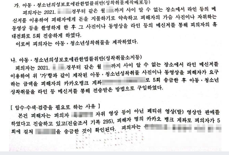 사건개요 : 트위터에서 '발 영상 판매합니다' 라는 제목을 보고 연락하게 되어 개당 1만 원 정도 하는 가격의 영상을 5개 구매하였고 압수수색을 받게 되었습니다.