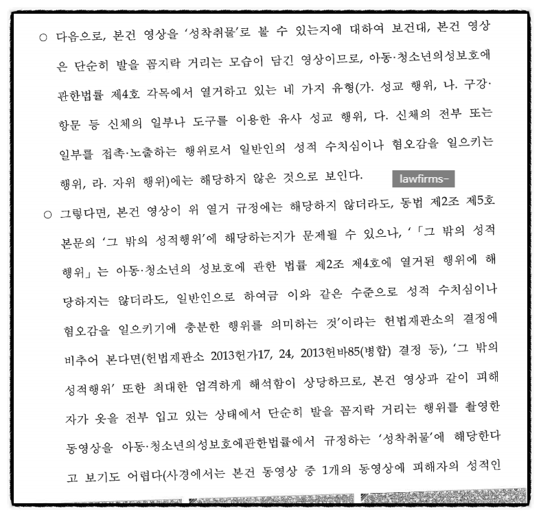 또한 본건 촬영물들은 오직 발 영상으로서 아동 청소년의 성보호에 과한 법률 제2조 제4호 가목, 나목, 라목(성교행위, 유사성교행위, 자위행위) 에는 전혀 해당하는 바가 없고