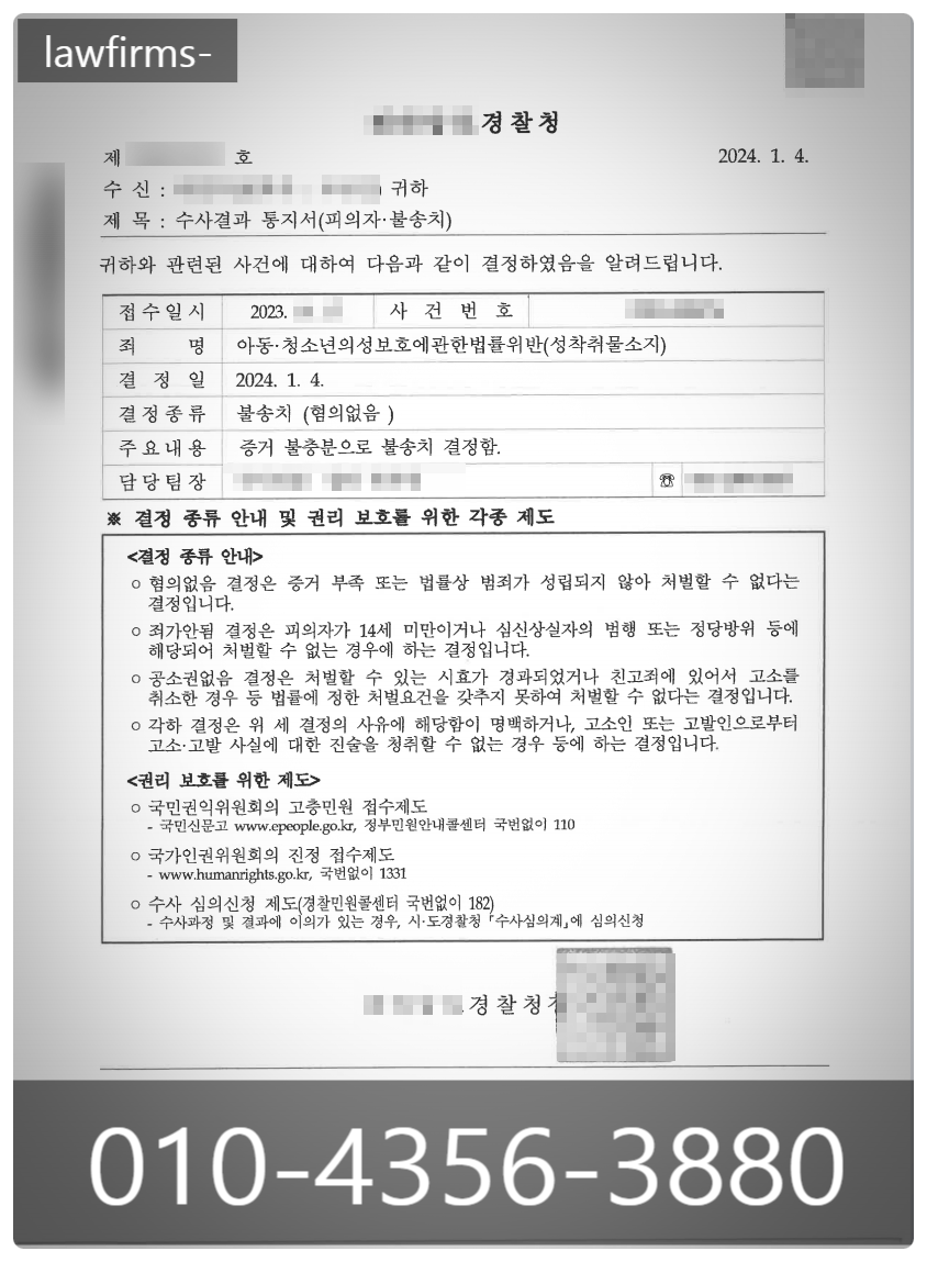 이러한 점을 정확히 파악하고 있던 법무법인 에스는 조사입회와 수사관의 소통만으로 불송치 결정을 받을 수 있었습니다.