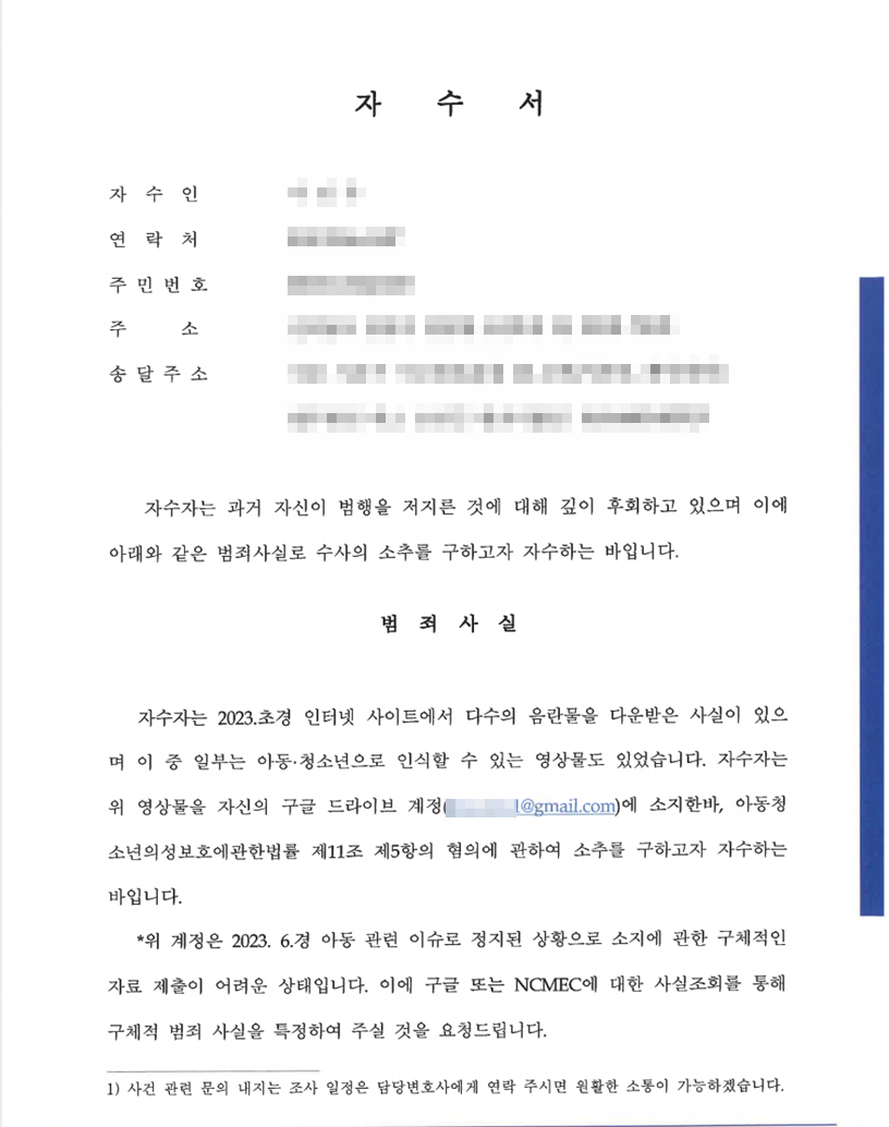 영상은 이미 스마트폰에서 모두 삭제한 터라 증거 자체가 없어 자수서에 ncmec에 사실조회를 통해 범죄 사실을 특정하여 주실 것을 요청드렸습니다.