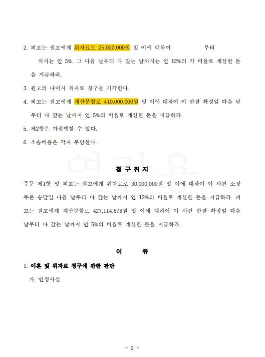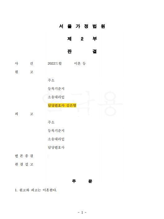 비록 남편으로부터 폭력을 당한 증거는 남아 있지 않다고 하더라도, 재판부는 '당사자들의 가사조사 진술'을 근거로 하여 유책사유를 판단하였고, 의뢰인은 남편으로부터 2,500만 원의 위자료를 지급받을 수 있게 되었습니다. 재산분할에 있어서도, 남편 소유의 모든 재산 뿐만 아니라 남편이 소송 직전 은닉한 현금 재산까지 분할대상 재산에 포함되었고, 의뢰인의 기여도 역시 50%로 인정되었습니다. 소송 결과, 의뢰인이 원하는 바에 따라 위자료 및 재산분할을 최대로 인정받으며 성공적으로 이혼에 이를 수 있었습니다.
