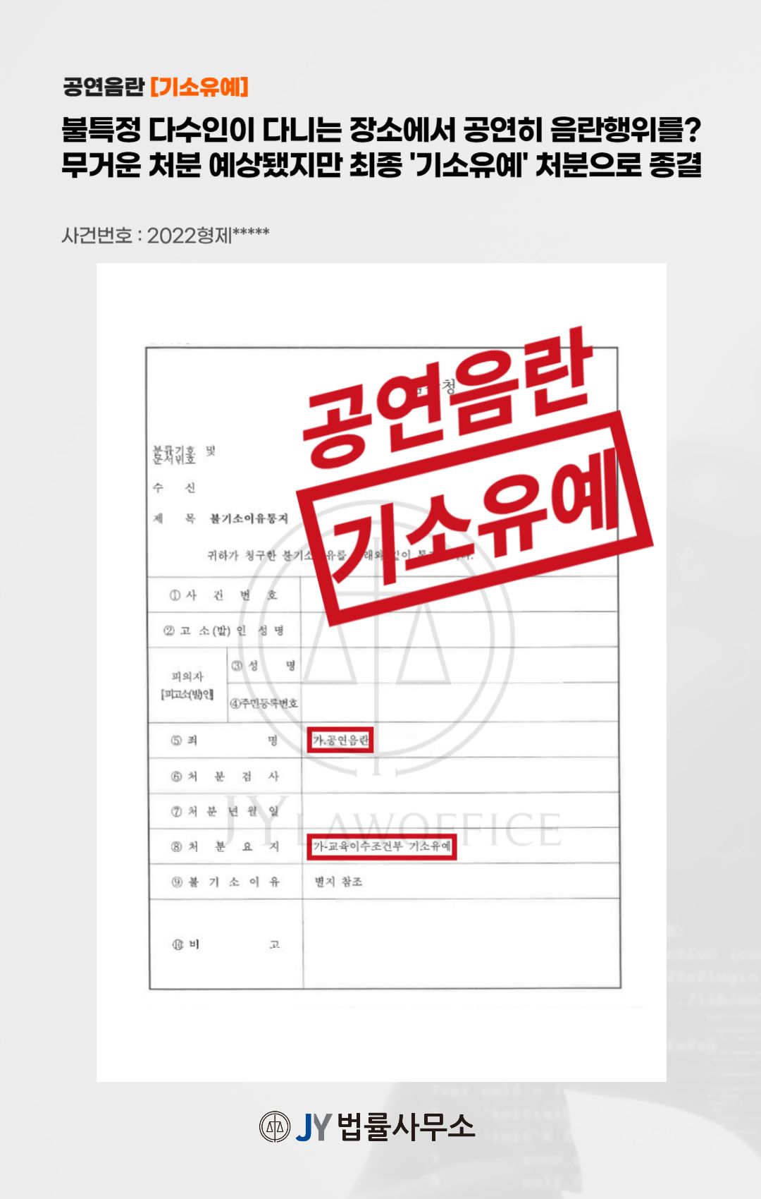 본 사건의 의뢰인은 불특정 다수인이 다니는 장소에서 공연히 음란행위를 함으로써 '공연음란'죄가 적용되었고, 이후 절차에 대해 자문하고자 본 JY법률사무소를 찾아주셨습니다.