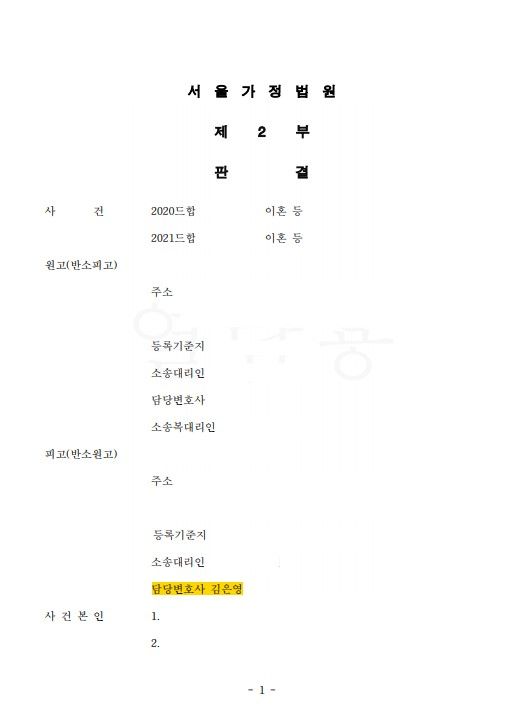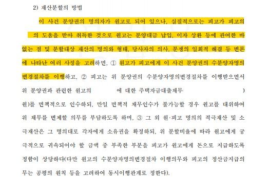 한편, 아내는 의뢰인 명의로 이미 아파트가 있고, 아내는 분양권을 보유하고 있으며, 각자 아파트와 분양권을 나눠 소유하는 것이 적절하다는 의견을 개진하였습니다. 이에 김은영 변호사는 아내 명의의 분양권은 실질적으로 의뢰인이나 의뢰인 가족의 재산이나 다름없기 때문에 아내로부터 반드시 명의 이전을 받아야 한다고 주장하였습니다.