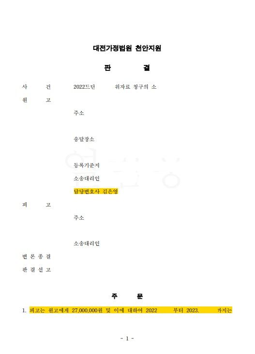 결국, 재판부는 사실조회 기록을 근거로 하여 소송 중에도 상간자가 부정행위를 이어갔음을 인정하였고, 이러한 상간자의 태도를 고려하여 위자료로 2,700만 원과 지연이자, 소송 비용 또한 피고가 전부 부담하는 것으로 판결하였습니다. 통상적으로 사실혼 관계에서 1000만 원-1,500만 원의 위자료가 정해지는 것과 다르게, 의뢰인이 원하였던 것보다 더 높은 액수의 위자료를 판단받으며 성공적으로 마무리 한 사안입니다.