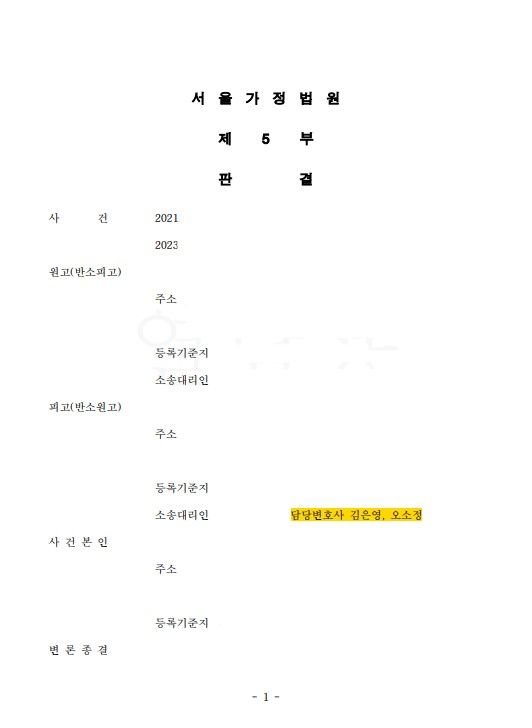 재산분할에 있어, 남편은 모든 재산을 '남편 명의'가 아닌 '법인 명의'로 두고 있었습니다. 재산분할 원칙 상, 부부 명의로 된 재산만이 재산분할 대상이 되므로, '법인 명의'로 된 재산은 재산분할이 될 수 없었습니다. 이에 김은영 변호사는 남편이 대표로서 보유한 회사 주식에 대한 감정을 신청하며 남편의 재산 상황을 최대한 파악하고자 하였습니다. 남편이 대표이사로 보유한 퇴직금 또한 있을 것이므로, 재판부에게 이를 확인하여 줄 것을 요청하였습니다.