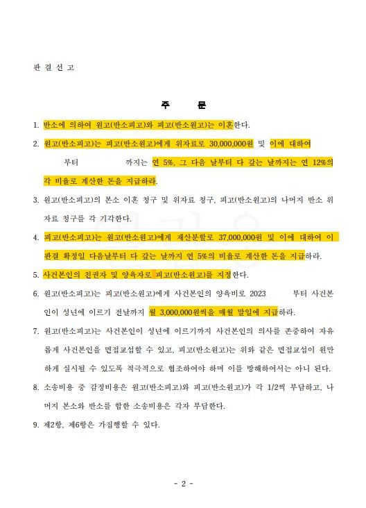 재판부는 '혼인 파탄의 궁극적 원인'과 '부부 간 갈등이 심화된 원인'은 남편의 부정행위가 발각된 데에 있음을 인정하며, 반소에 의한 이혼 청구 및 위자료 3천만 원을 인용하였습니다. 또한, 남편이 대표로서 보유한 회사 주식과 퇴직금을 모두 재산분할 대상으로 보았고, 의뢰인이 전업주부였어도 20년 간 남편을 내조하였던 기여를 50%로 인정하며, 사실상 남편이 청구한 10억 원의 재산분할 청구를 방어하였습니다. 재판부는 남편이 의뢰인에게 지급해야 할 양육비 역시 양육비산정기준표보다 높은 액수인 300만 원을 인정하였던바, 이혼, 위자료, 재산분할, 양육비에서 전부 승소를 이뤄낸 성공적인 사건입니다.