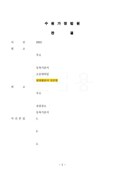 김은영 변호사는 가정폭력 증거를 제출하고 남편이 고의적으로 소송 상 대응을 게을리하고 있음을 재판부에 적극 어필하였고, 빠른 시일 내에 의뢰인이 청구한 내용대로 재판부에서 판단을 해줄 것을 요청하였습니다.