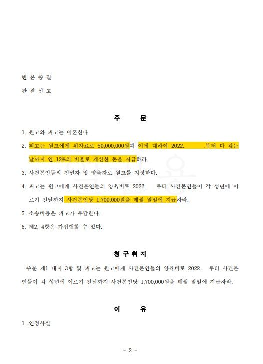그 결과, 재판부는 남편이 고의적으로 소송을 회피하고 있음을 인정하며, 약 4개월 만에 의뢰인이 청구한 이혼, 위자료 5천만 원, 양육비 월 170만 원 청구 전부를 인용하는 판결을 내리셨습니다. 협의가 어려운 상황에서도 소송을 통해 이혼에 이를 수 있었던 의미있는 사안입니다.