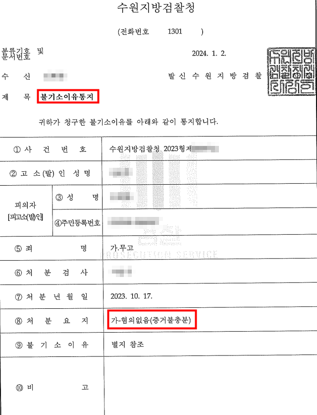 위와 같은 변호인의 주장을 받아들인 검찰은 의뢰인에게 혐의없음(증거불충분) 처분을 하였습니다. 이로써 의뢰인은 자신의 억울함을 풀 수 있었습니다.