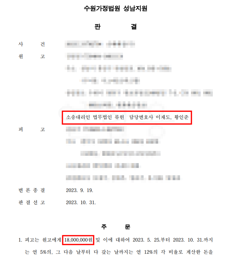 의뢰인은 전처와 약 13년간 혼인 관계를 유지하였고, 협의이혼 이후 상간 소송을 제기하게 되었습니다. 본 사건에서 문제가 되었던 건 혼인 관계가 유지되고 있던 기간에 부정행위가 이루어졌다는 점이었고 소송대리인의 조력을 받아 상간남이 인정치 않았던 부정행위가 명백함을 입증하여 18,000,000원의 위자료 판결을 받을 수 있었습니다.