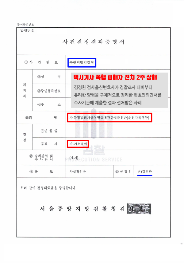 그 결과 수원지방검찰청 담당 검사는 경찰조사 내용과 함께 김경환 대표변호사의 의견서 내용을 인정하여, 재판에 회부하지 않고 운전자폭행 기소유예 처분으로 사건을 종결했습니다.