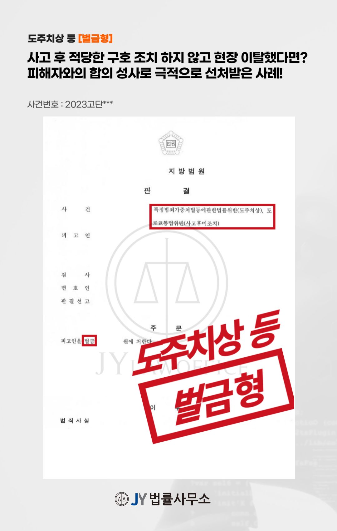 본 사건의 의뢰인은 사고를 일으킨 후 그대로 현장을 이탈해 '도주치상', '사고후미조치'의 혐의를 받게 되었습니다. 이에 의뢰인은 본 JY법률사무소를 찾아 사건을 정식 의뢰해 주셨습니다.