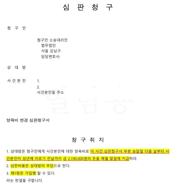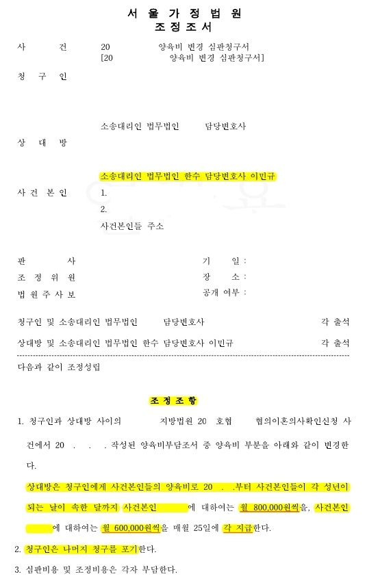 오늘은 협의 이혼한 부부의 일방 배우자(상대방)을 대리하여 양육비 변경 심판청구가 들어온 사건에 대하여 방어를 통해 조정으로 마무리한 성공사례를 안내드리고자 합니다.