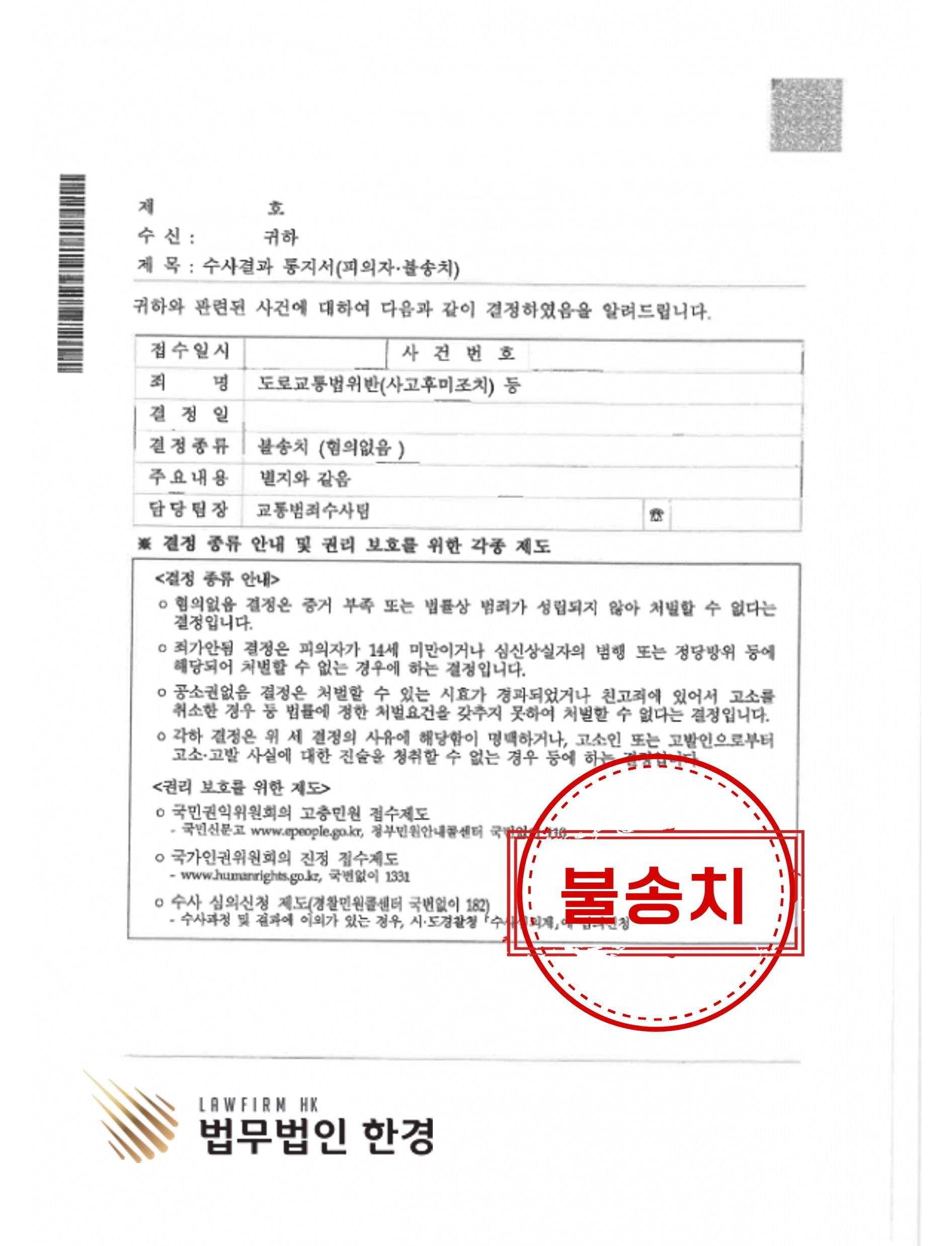 법무법인 한경 변호인단은 경찰조사 시 의뢰인이 제출한 블랙박스 영상을 바탕으로 상대방 운전자가 주장하는 상해 등에 관하여 강력하게 부인 하였고 도주의 고의가 없었던 점을 주장하였습니다. 경찰조사 후에도 변호인의견서를 통하여 그 혐의를 재차 부인하였습니다.