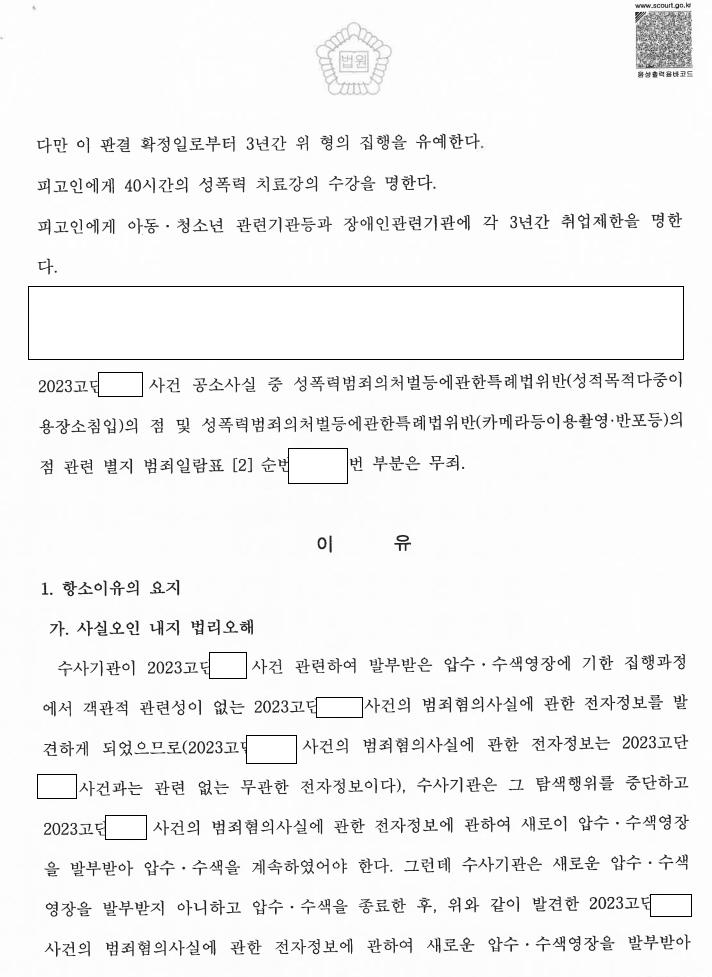 결국 항소심 법원에서는 압수수색이 위법했다는 제 주장을 받아들인 것입니다. 그래서 무관한 정보를 압수한 추가 기소건에 대해 일부 무죄가 선고되었고, 집행유예가 나온 것입니다.