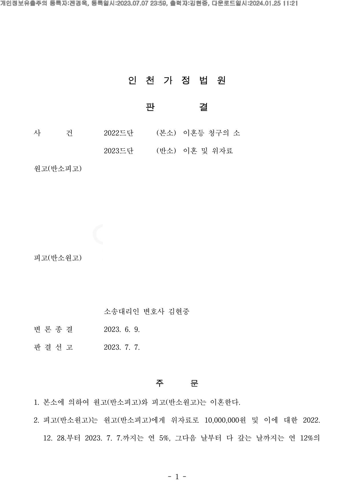 원고가 제출한 카카오톡 대화내역, 블랙박스 영상, 모텔 결제내역 등 피고가 바람을 피워 재혼을 준비 중이던 사실을 증명하는 증거는 명백 하였기에,