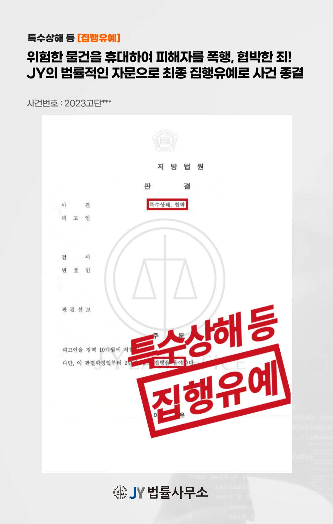 본 사건의 의뢰인은 위험한 물건을 휴대하여 피해자를 폭행, 협박한 죄로 '특수상해 및 '협박' 혐의를 받게 되었습니다. 이에 의뢰인은 법률적인 자문을 얻기 위해 본 JY법률사무소를 찾아주셨습니다.