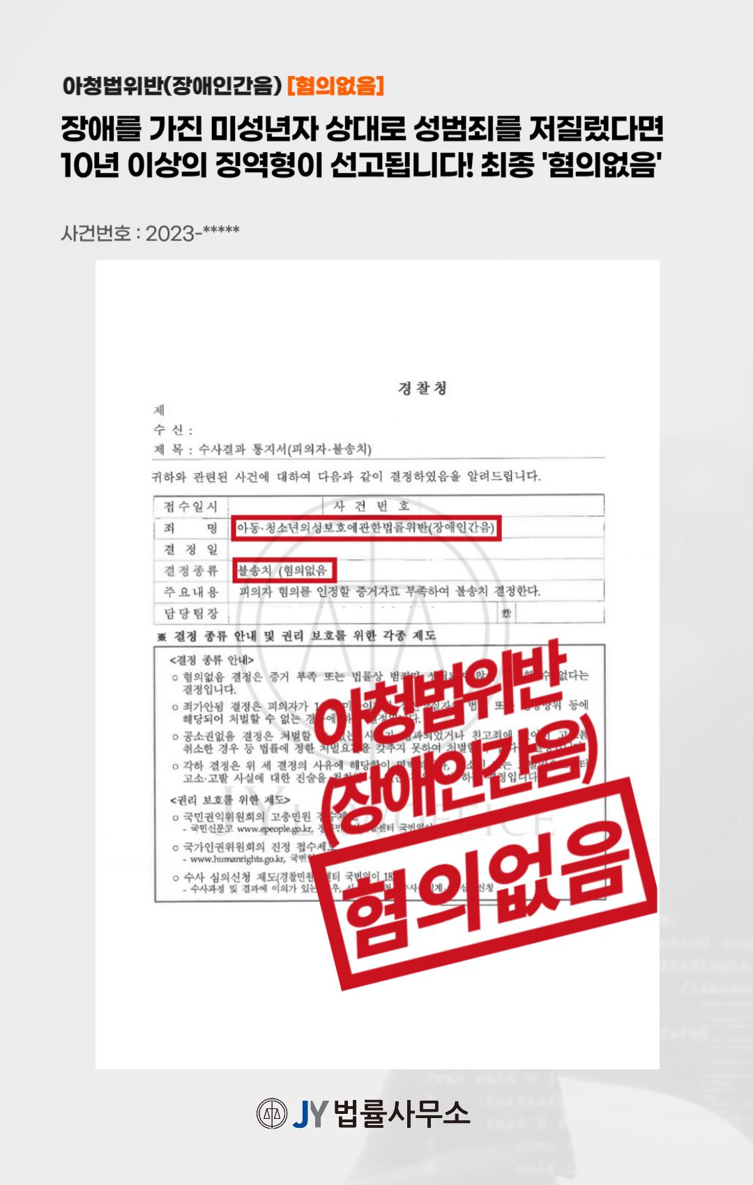 이와 같은 변호인의 노력에 따라, 의뢰인은 '아동ㆍ청소년의성보호에관한법률위반(장애인간음)' 혐의에서 불송치 처분을 받고 무사히 사건을 종결시킬 수 있었습니다.