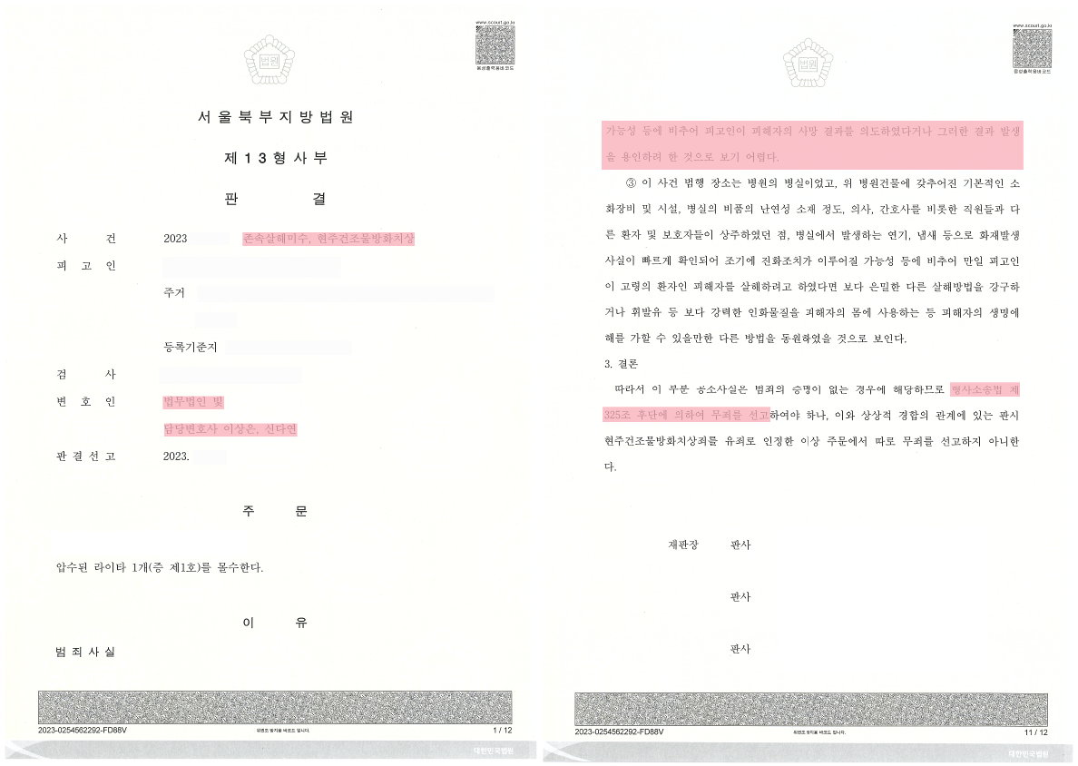 판단을 내려 현주건조물방화치상죄 혐의는 유죄, 존속살해미수는 무죄로 판결했습니다.