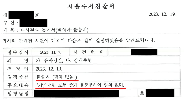 이상과 같이 부유는 억울함을 호소하는 의뢰인을 진심으로 돕고자 하는 마음으로 사건에 대한 객관적인 증거와 신빙성 높은 진술을 토대로 최상의 전략을 수립하여 대응한 결과, 수사기관은 피해를 입증할 증거가 부족하고 피해자의 진술에 대한 신빙성이 의뢰인의 혐의를 인정할 수 있을 정도로 높다고 보기 어렵다고 판단하면서 의뢰인에 대하여 ‘혐의없음’의 의견으로 불송치 결정을 하였습니다